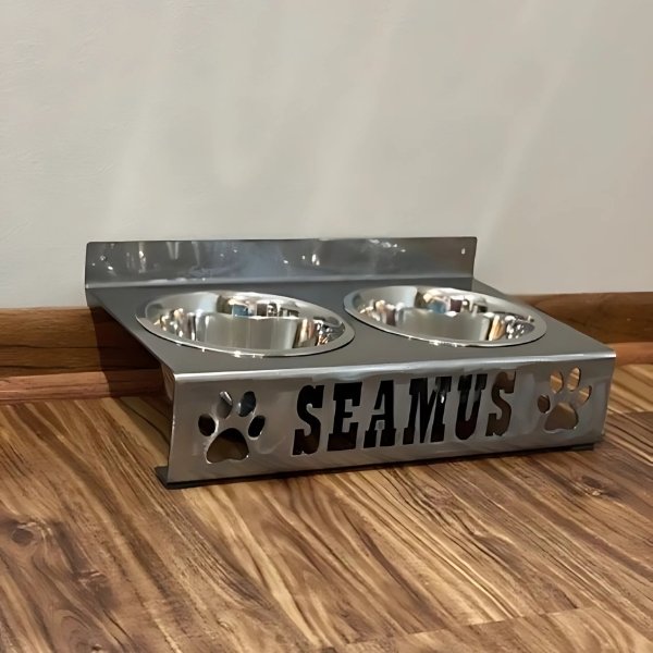 Keep your pet’s feeding area tidy and stylish with this custom stainless steel wall-mounted feeder. Personalized with your pet’s name and designed with adorable paw prints, it includes two removable stainless steel bowls for easy cleaning.