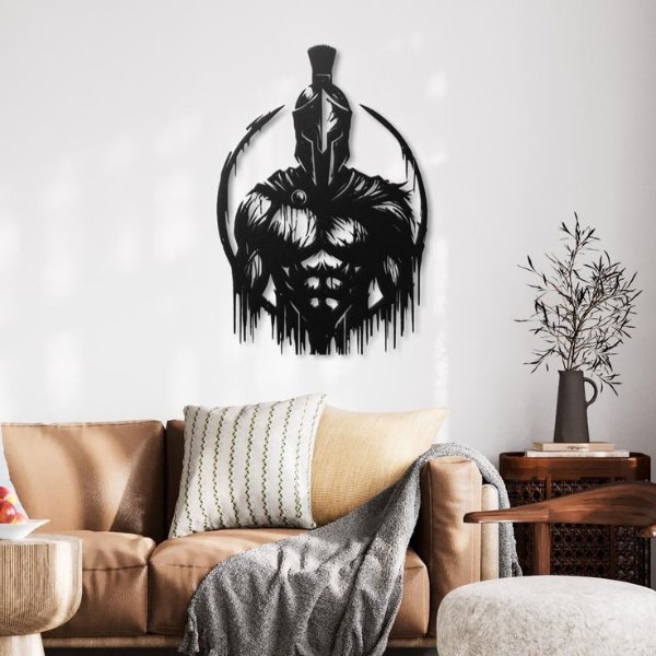 Bold black metal wall art featuring a Spartan warrior — perfect for man caves, gyms, or modern interiors.